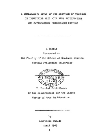 Hualde, L. (1969). A comparative study of the behavior of teachers in industrial arts with very satisfactory and satisfactory performance ratings (Unpublished Master’s thesis). Central Philippine University, Jaro, Iloilo City.