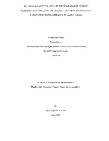Chan, J. R. M. (2018). Inflicting or not? The level of effectiveness of product placements in affecting the credibility of news programs as perceived by radio listeners of Maasin, Iloilo (Unpublished special paper). Central Philippine University, Jaro, Iloilo City.