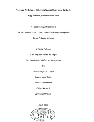 Duropan, T. M. P., Bolina, L. M., Lebanan, A. L., Navalta, F. III, & Provido, J. L. (2023). Preferred attributes of millennials towards Kalan-an sa Garden in Brgy. Tinorian, Barotac Nuevo, Iloilo [Unpublished special paper). Central Philippine University.