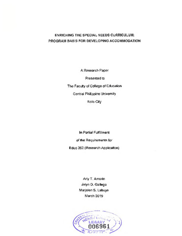 Amorin, A. T., Gallego, J. D., & Labuyo, M. S. (2019). Enriching the special needs curriculum: Program basis for developing accommodation [Unpublished special paper]. Central Philippine University.